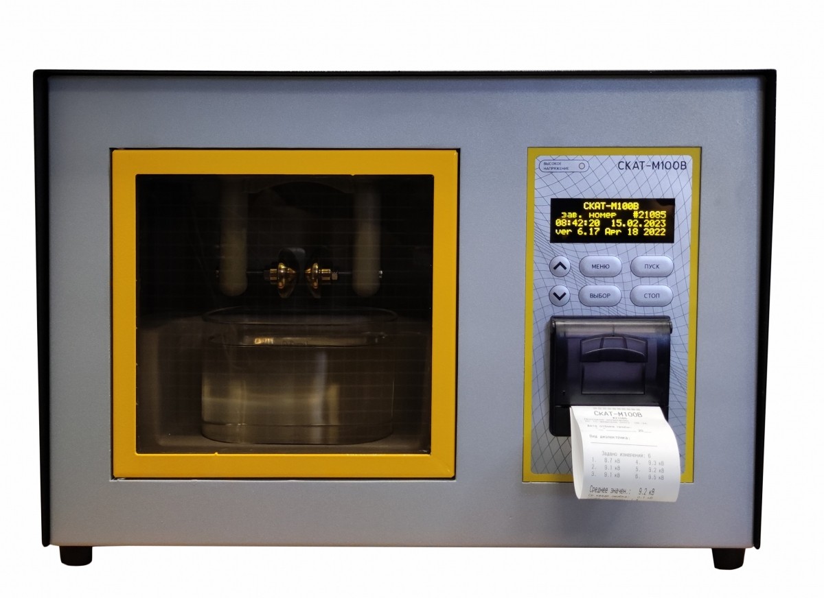 Аппарат «СКАТ-М100В» предназначен для измерения напряжения пробоя трансформаторного масла и других диэлектрических жидкостей при испытаниях переменным напряжением синусоидальной формы частотой 50 Гц, согласно ГОСТ 6581-75.