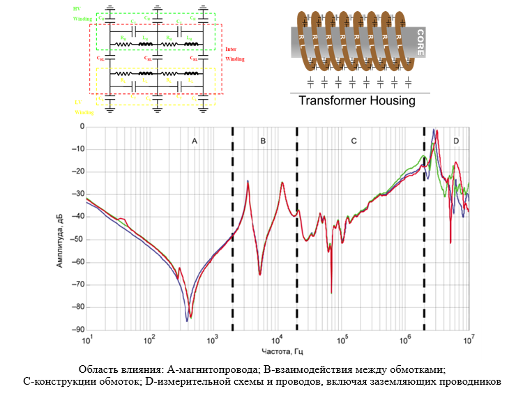 Существует метод оценки механического состояния обмоток SFRA в диапазоне частот от 20 Гц до 2,0 МГц. Трансформатор можно представить в виде комплексной электрической схемы замещения, состоящей из сопротивлений, емкостей и индуктивностей.