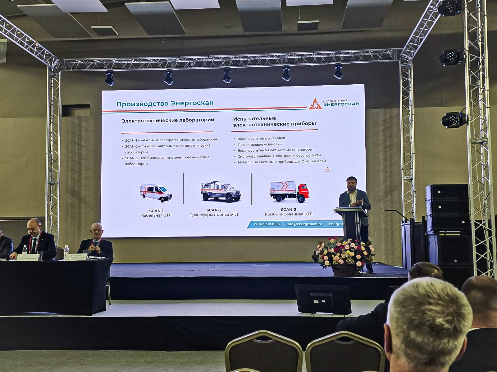 Технический директор УТЦ «Энергоскан» Евгений Быков выступил с докладом, посвященным современным решениям в области диагностики электрооборудования. В ходе презентации были представлены передвижные электротехнические лаборатории собственного производства и приборы для определения мест повреждения кабельных линий, разработанные компанией.